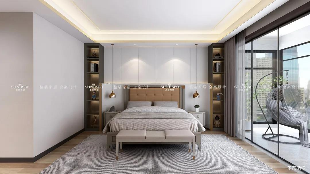 通过空间的叠加与缩放、玻璃透明属性及肌理变化,塑造卧室简奢均衡的气质,也让整个房间静谧又典雅,给业主以无限回味的安定感和幸福感。